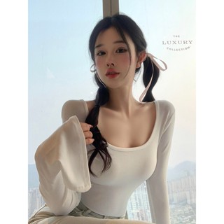 Red Murni Keinginan Besar Leher U Lengan Panjang T-shirt Wanita Musim Semi 2023 Seksi Ketat Elastis Dalam Kemeja Pendek putih Top
