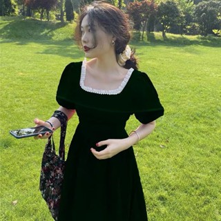 Red Perancis retro lengan pendek gaun musim panas pakaian wanita baru mutiara persegi kerah slim dan asin manis platycodon mid-length dress untuk wanita