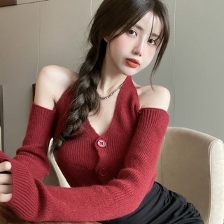 Suhao Tik Baru Musim GugurTok Pop Pakaian Murni Keinginan Leher Off-shoulder Lengan Panjang V-Neck Knit Spice Girl Top