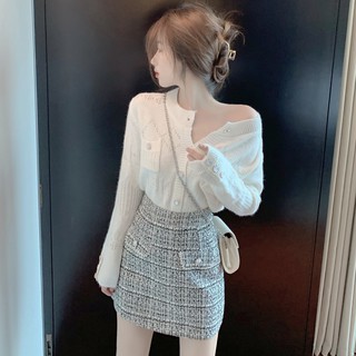 Baru Round Leher Lengan Panjang Rajutan Cardigan Jaket+Retro Tweed Pinggang Tinggi Rok Fashion Wanit
