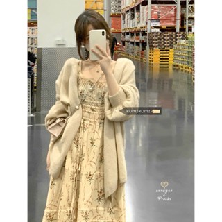 Red Setelan angin keinginan lembut dan murni rok bunga ceruk suspender dress wanita musim semi sweater kardigan jaket set dua potong