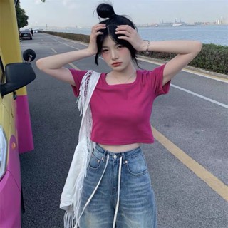 Red Kapas Lengan Pendek Kerah Persegi T-shirt Wanita Rasa Desain Niche Irregular Pendek Manis dan Pedas Slim Top 2023 musim Panas