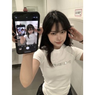 Red Kapas murni logam cair putih bahu depan lengan pendek t-shirt wanita rasa desain niche slim slim hot girl short top