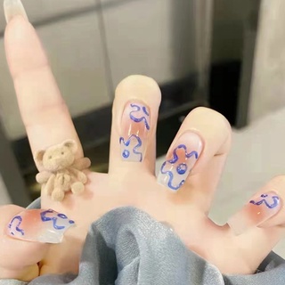 24pcs / box Kuku Palsu Panjang Motif Bunga Warna Biru Coklat