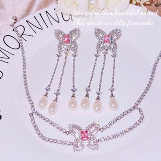 Goldkingdom Fashion Perhiasan Aksesoris Ready Stock Desainer Mewah Super Peri Kupu-Kupu Kalung Kecil Mengkilap T Persegi Merah Muda Berlian Anting Mutiara Perempuan
