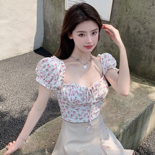 Kemeja lengan gelembung leher persegi bunga wanita musim gugur atasan manis tipis