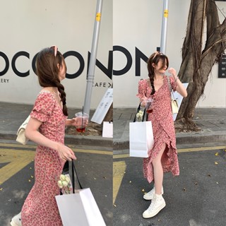 Red Versi Korea dari layar penuh gelombang man peach jantung kerah rok bunga temperamen Korea ramping puff lengan gaun celah sifon musim semi