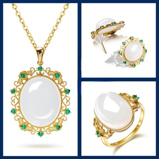Goldkingdom Fashion Perhiasan Aksesoris Ready Stock Baru Caibao Hetian Jade Ear Studs Ear Ornaments White Jade Pendant Adjustable Cincin Kalung Set Perempuan