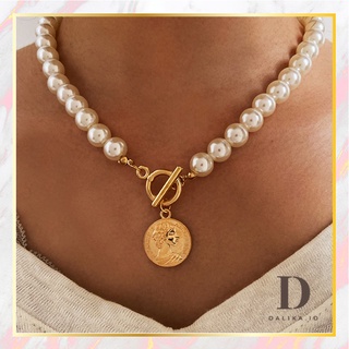 Kalung Mutiara Choker Vintage Liontin Koin lapis Emas Fashion Korea