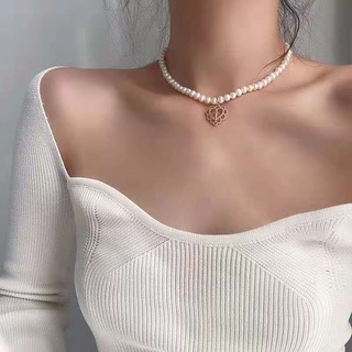 Kalung Rantai Klavikula Hias Liontin Hati Mutiara Model Lapis Ganda Warna Hitam Gaya Retro