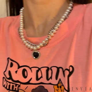 Kalung Rantai Klavikula Model Double Layer Aksen Mutiara Warna Hitam Gaya Retro Hip-Hop Untuk Wanita