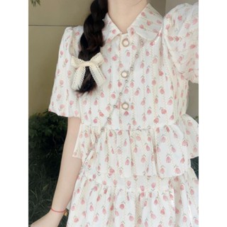 Red Bunga Tulip Berlapis Kue Rok Palsu Dua Potong Kerah Kemeja Gaun Wanita Musim Panas Puff Lengan Kecil Rok Pendek