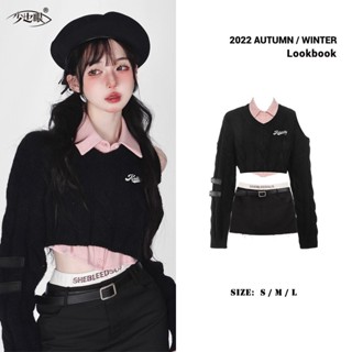 Suhao setelan dua potong kemeja + sweater rasa desain ceruk wanita lengan panjang slim off-shoulder pendek musim gugur pullover top