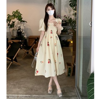 Red dreesManis mengurangi usia kerah persegi gaun lengan terbang wanita musim panas rok A-line longgar kecil rok pendek