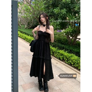 Red dreesGaun suspender hitam gaya liburan musim panas wanita longgar dan rok A-line celah tipis rok panjang sedang