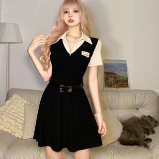 Red Musim Panas Gaya Amerika Rapi Polo Kerah Palsu Gaun Dua Potong Wanita All-Match Splicing Pinggang Tinggi Rok Pendek A-line Tide