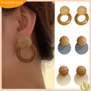 < Freshbread > 1pasang Ear Studs Retro Rustic Gaya Simple Kasual Artistik Kayu Cincin Berongga Raffia Straw Splicing Women Earrings Untuk Pacaran