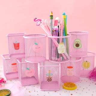 Pink Square Round Shape Milk Peach Banana Pattern Metal Hollow Out Storage Pen Holder for Student Gift