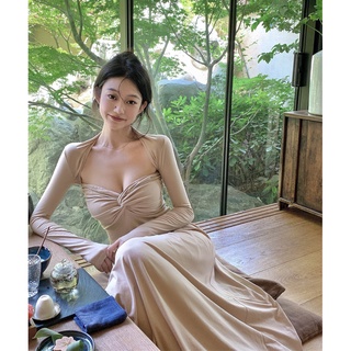 Setelan Wanita Musim Gugur Pendek Perlindungan Matahari Cardigan Selendang Pinggang Pinggang Tipis Tube Top Gaun Rok Panjang Temperamen dan Fashion Dua Potong Set