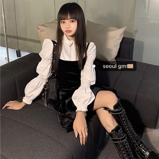 Red Setelan dua potong wanita gaya gelap desain kecil kemeja putih lengan engah + suspender beludru emas rok hitam kecil