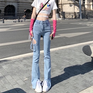 Red Hot girl micro-horn high-waisted jeans wanita musim panas desain rasa lubang split mengepel celana longgar lurus celana trendi