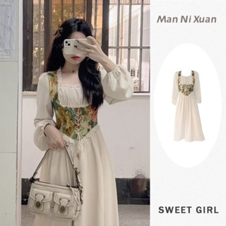 Red French Tea Break Kerah Persegi Gaun Bunga Wanita Musim Panas 2023 Baru Temperamen Lembut Pinggang Pelangsing Rok Panjang A-line