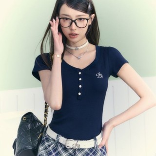 Red ANDYET AD1 23/SS Asli Bordir Logo Tombol Setengah Kerah Terbuka Lengan Pendek Musim Panas Ramping Rajutan T-shirt untuk Wanita