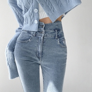 Red Fried Street Spice Girl Two-Piece Buckle Jeans Wanita Musim Gugur Skinny Look Slim Straight Pensil Tinggi Pinggang Spandex Hip-Up Celana