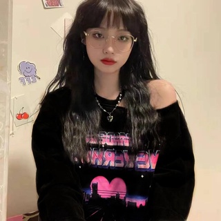 Suhao Amerika top 100% katun preppy leher bulat lengan panjang t-shirt wanita off-the-shoulder dicet