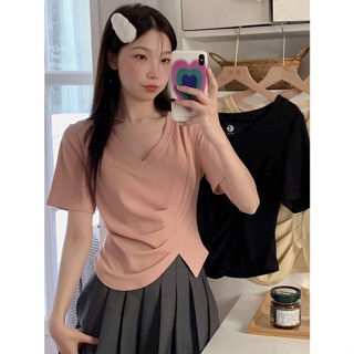 Red Ukuran Besar Bahu Depan Lengan Pendek T-shirt Wanita Rasa Desain Niche Musim Panas 2023 Baru Lemak MM Irregular Pendek Top