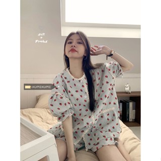 Red Strawberry Homewear Suit Wanita Jahitan Renda Longgar Piyama Musim Panas Kasual Celana Pendek Dua Potong Set