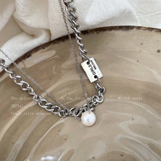 Double Layer Tumpuk Baja Titanium Persegi Merek Kuba Kalung Perempuan ins Trendi Hip Hop Punk Gaya Klavikula Rantai Mutiara Tunggal