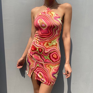 BIIKPIIK Eropa dan Amerika Fashion Wanita Baru Swirl Print Halter Leher Terbuka Kembali Gaun Slim Ta