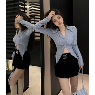 Red Gadis Seksi V-Leher Lengan Panjang Kemeja Wanita Musim Semi 2023 Desain Baru Plaid Slim Fit dan Tipis Kepribadian Top Pendek