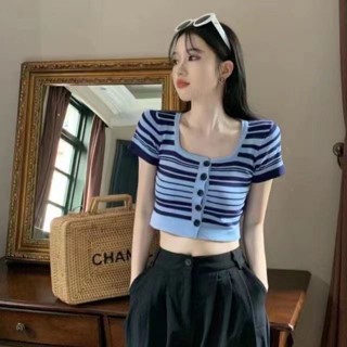Red Explosive Rajutan Bergaris Cardigan Pendek Atasan Wanita Kerah Persegi Rajutan Cardigan Gadis Seksi Tanaman Top Es Sutra Lengan Pendek musim Panas