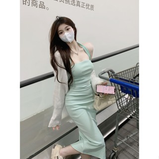 Red Keinginan Murni Gadis Panas Tube Top Lipit Gaun Musim Panas 2023 Baru Seksi Menggantung Leher Halter Kembali Slim Fit Tas Hip panjang Rok Wanita