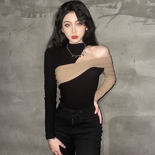 Desain ceruk warna kontras T-shirt tipis lengan panjang wanita musim gugur tidak teratur mesin peraw