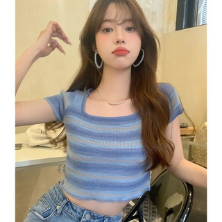 Sweater rajut bergaris warna kontras baru, kemeja bottoming kerah wanita 2022 musim panas pendek ram