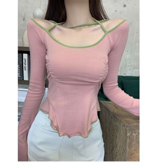 Red Pure Desired Sweet Hot Girl U-Neck Pendek Menggantung Leher Kemeja Wanita Inner Wear Design Rasa Niche Unik Khusus Lengan Panjang top