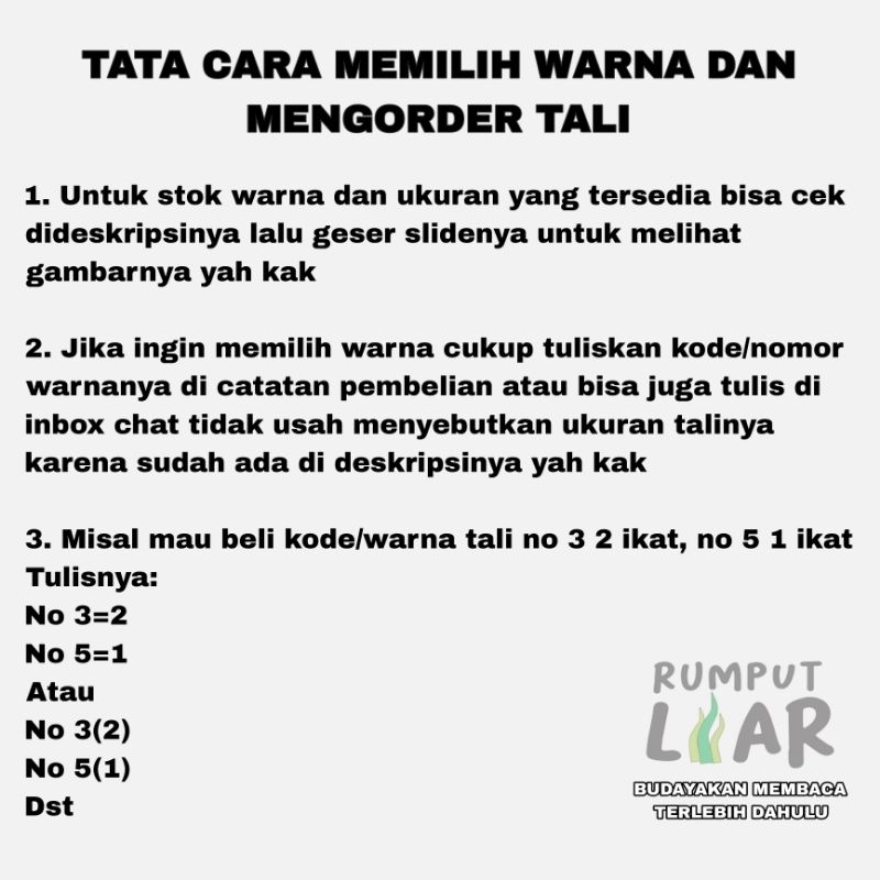 ▶️Tersedia Warna: 1. Hitam-putih 2. Mint 3. Kuning-putih 4. Abu-hitam-merah-kuning 5. Broken white-biru-merah 6. Merah-putih 7. Putih-biru-merah 8. Putih-biru muda 9. Coklat-silver 10. Thunder grey-putih-army-navy 11. Hijau stabilo 12. Orange 13. Hitam-kuning 14. Aqua blue 15. Krem 16. Coklat caramel 17. Hitam 18. Hitam-abu tua 19. Navy-pink fanta 20. Asphalt grey 21. Air force blue 22. Biru muda-putih 23. Biru-putih 24. Soft pink-putih 25. Pink-putih 26. Hyper pink 27. Rapsberry 28. Abu tua-hitam 29. Merah hati-putih 30. (SOLD) 31. Hijau-hitam 32. Hitam-abu 33. Violet-putih 34. Putih-hitam 35. Hitam-violet 36. Hitam-lavender 37. (SOLD) 38. (SOLD) 39. Peach-biru 40. Orange-putih 41. Orange-hijau muda-hijau 42. Dark chocolate 43. Hijau daun 44. Ecru brown 45. Navy 3mm 46. (SOLD) 47. Merah 48. Merigold 49. Hitam-silver 50. Black navy 51. Navy 52. Abu muda 53. (SOLD) 54. Stone grey-putih 55. Hitam 2.5mm 56. Putih 57. Army 58. Hitam-orange 59. Hitam-biru muda
