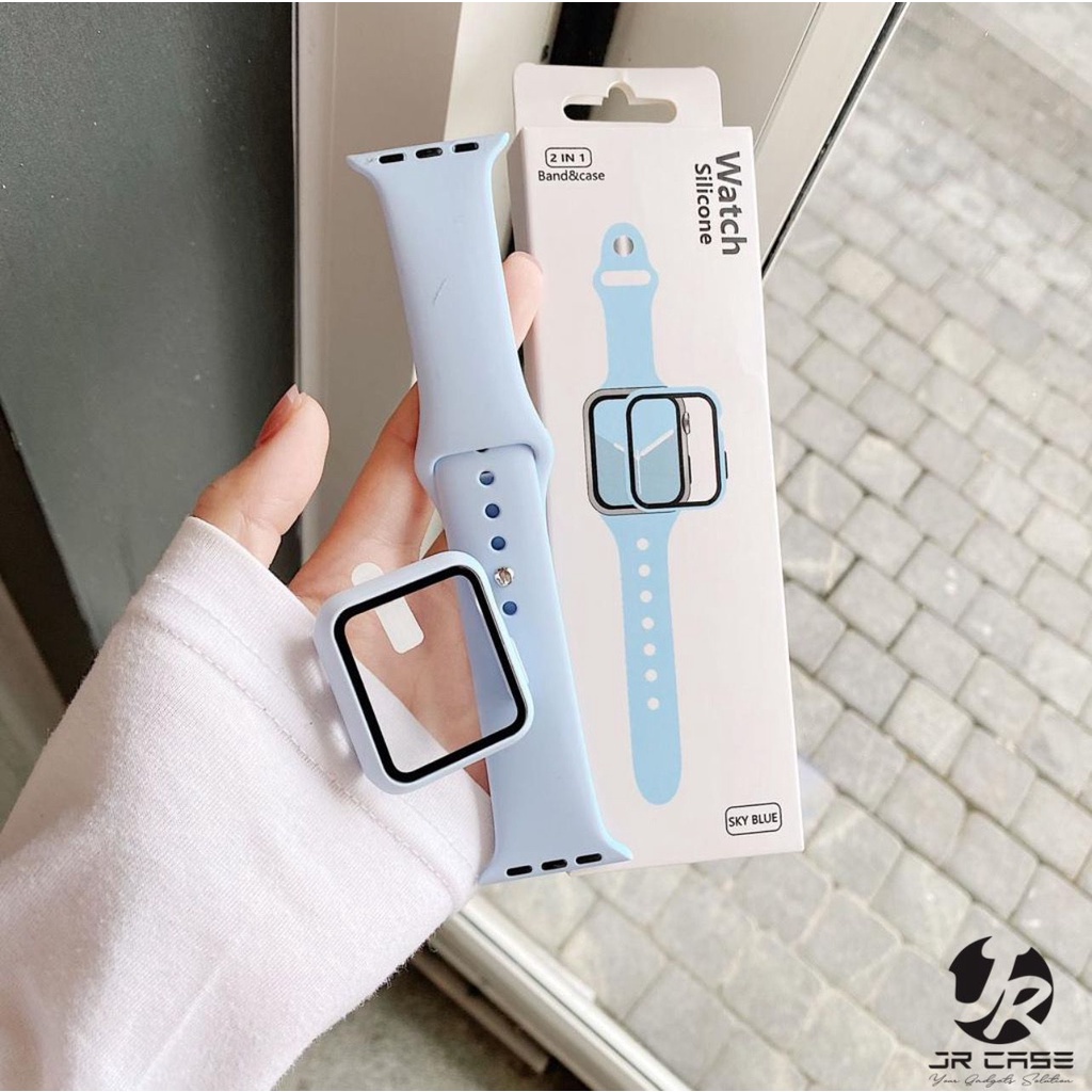 Tali Strap Apple Watch 2 in 1 Ukuran 38mm 40mm 41mm 42mm 44mm 45mm Series 1 2 3 4 5 6 7 8 SE Beserta Tempered Glass Case Strap Sport Band iwatch Full Color Silicone Rubber
