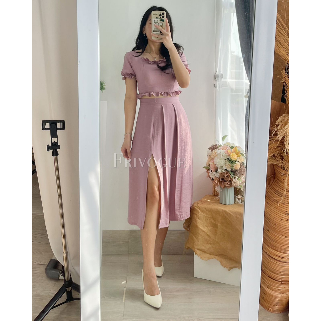 READY STOCK Top : Lingkar dada 74-102 (belakang karet smock) Lingkar pinggang 33-74 Panjang 35 Rok : Lingkar pinggang 64-88 (belakang pinggang karet) Panjang 73 Tinggi belah 40 Bahan soft linen crinkled Berat 300gr