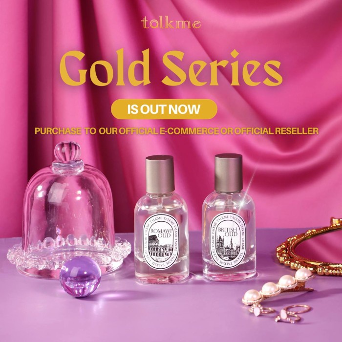 Talkme Gold series produk parfum lokal yang kami luncurkan ini akan menjadi teman setia kamu dalam menjalani aktivitas di setiap harinya. Dengan wewangian yang terinpirasi dari wangi2 intim timur tengah nan mewah berbahan dasar oud yang masih jarang kita temui dalam brand parfum lokal lainnya.