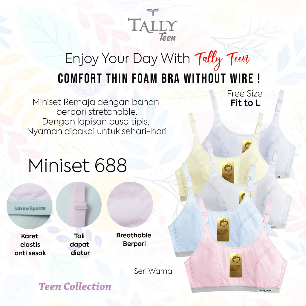 TALLY MINISET Remaja 688 adalah BH yang nyaman digunakan untuk sehari-hari bagi ABG / Remaja. Bahannya tidak panas sehingga nyaman digunakan di daerah tropis seperti Indonesia. Dijamin cocok buat kamu deh ladies. Harganya terjangkau dan semua produk di toko kami 100% ori yaa...