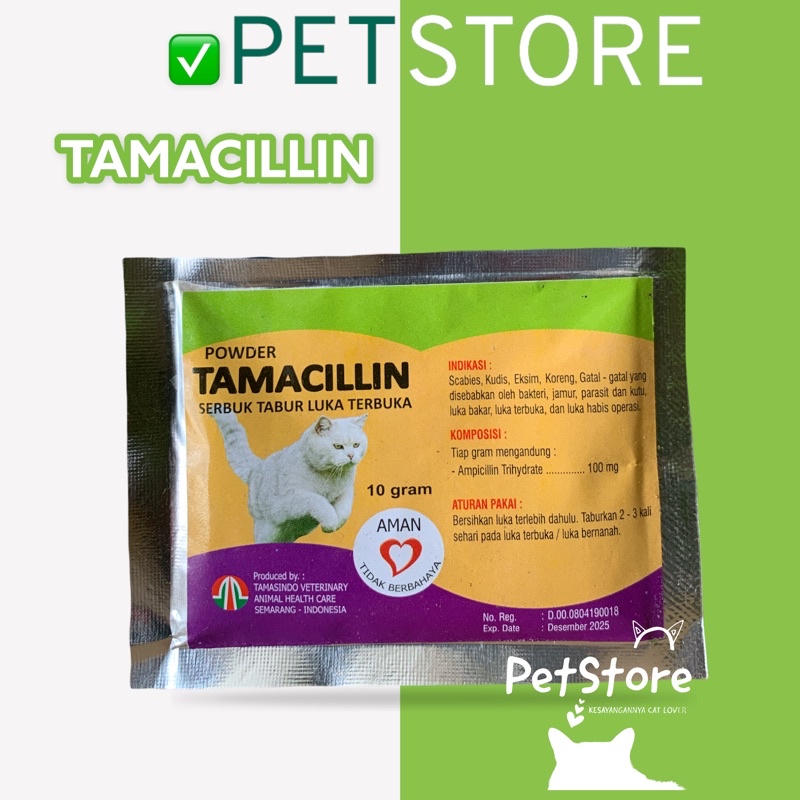 Tamacillin adalah obat serbuk untuk mengobati luka terbuka pada hewan kucing peliharaan yang aman dan tidak memberikan efek samping negatif meskipun terjilat oleh hewan. Tamacilling mengandung Ampicilin Trihydrate yang khusus untuk hewan dengan komposisi tepat sehingga aman untuk digunakan pada kucing maupun anjing.