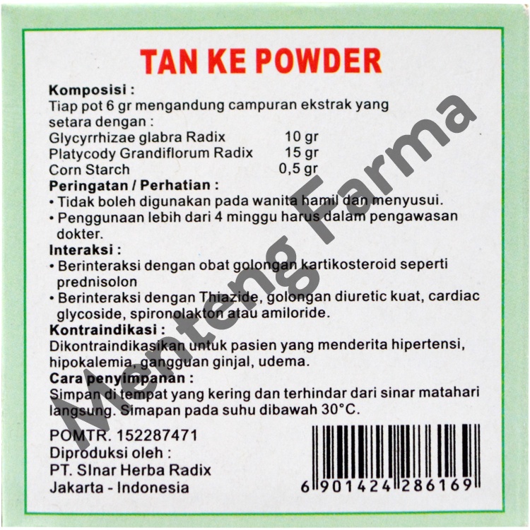 Tan Ke Jing San (Tan Ke Powder) merupakan obat herbal China yang terbuat dari campuran bahan-bahan tradisional yang diekstrak dalam bentuk bubuk. Dimana obat ini memiliki khasiat yang dapat membantu meningkatkan kesehatan sistem pernapasan, meredakan peradangan di tenggorokan, meredakan batuk, mengeluarkan dahak yang berlebih, serta mengurangi sesak napas yang dikarenakan bronkitis akut dan kronis.