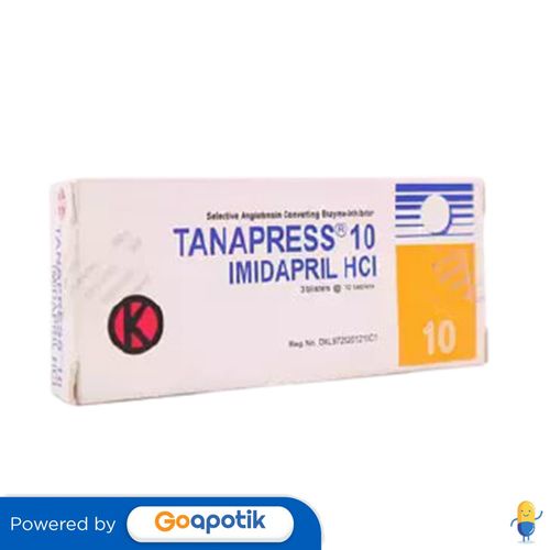 Deskripsi : PENGGUNAAN OBAT INI HARUS SESUAI PETUNJUK DOKTER. Tanapress digunakan untuk terapi pada pasien yang memiliki tekanan darah tinggi | Komposisi : Tiap tablet mengandung imidapril 10 mg | Dosis : ATURAN PAKAI HARUS SESUAI DENGAN PETUNJUK DOKTER. Dewasa : Dosis lazim 5-10 mg 1 kali sehari. Pada penderita hipertensi berat atau hipertensi parenkimal renal atau kerusakan renal/ginjal : Dosis awal yang dianjurkan 2,5 mg 1 kali sehari | Indikasi : Untuk terapi hipertensi | Perhatian Khusus : Gangguan ginjal serius (bersihan kreatinin < 30 mL/menit atau kreatinin serum > 3 mg/dL). Penurunan dosis lazim sampai dengan separuhnya atau selang waktu yang lama antar pemberian obat. | Kemasan : Dus 3 X 10 tablet | NIE : DKL9725201210C1