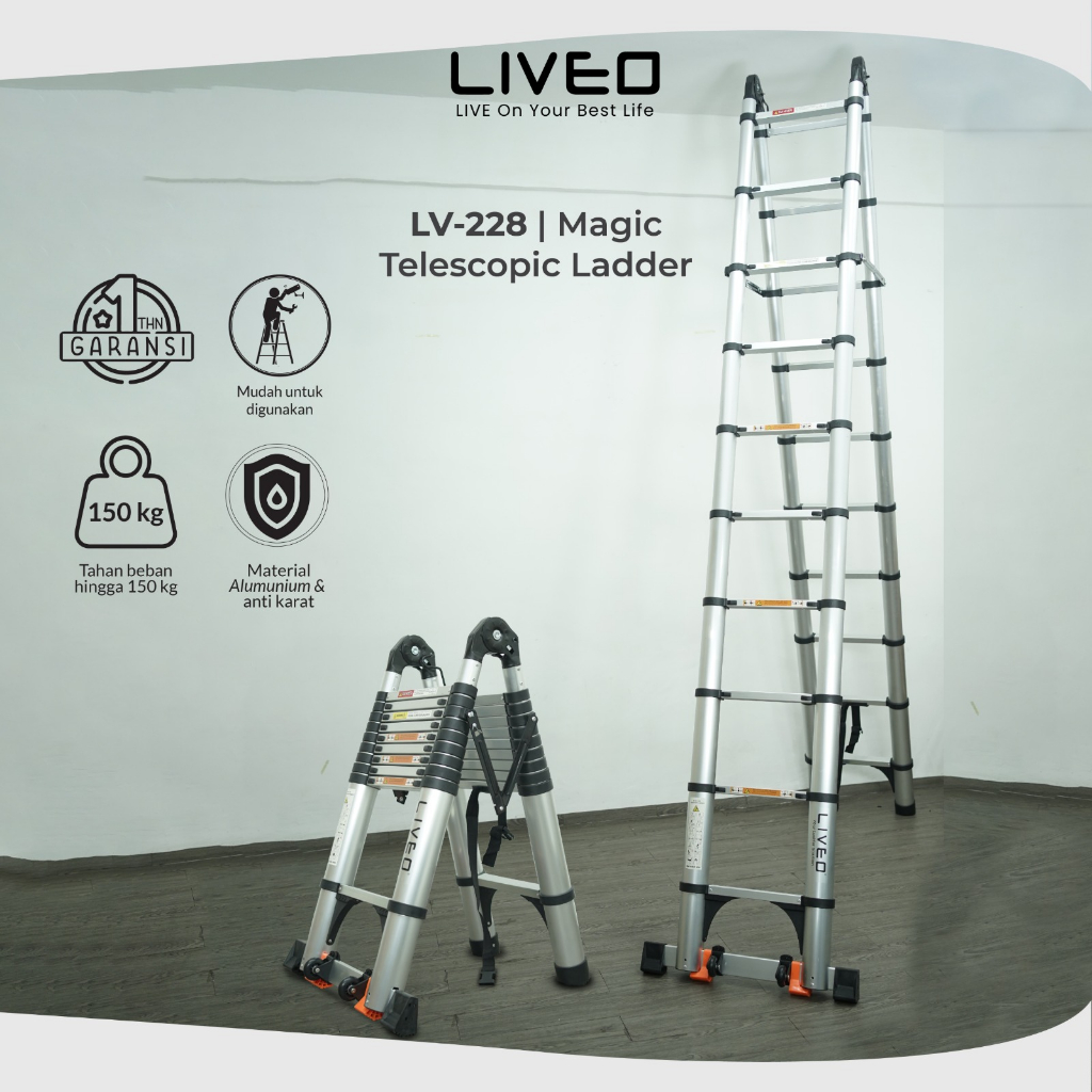 MAGIC TELESCOPIC LADDER LIVEO LV-228 Merk : LIVEO Model : LV-228 Bahan : 100% Alumunium 1,5mm DimensiProduk : 8 x 49 x 112-780cm DimensiDus : 51 x 25 x 113cm G.W/N.W : 24 kg/25 kg