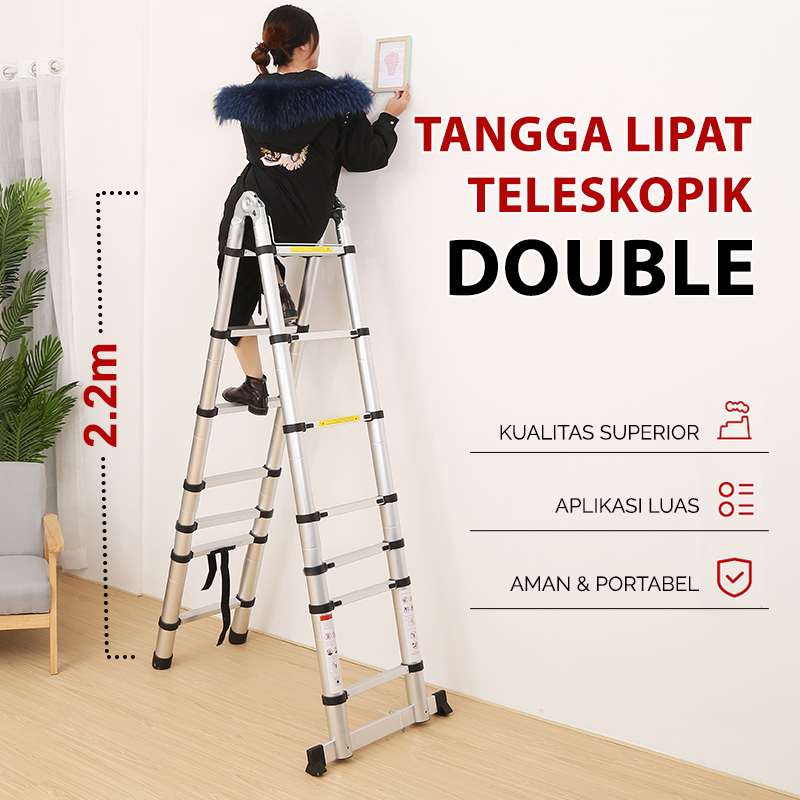 Daya Tahan & Stabilitas - Tangga teleskopik dirancang dengan rangka paduan aluminium tugas berat, dengan anak tangga lebar anti selip dan kaki bersudut anti selip dengan batang penstabil yang memastikan pengalaman pendakian yang aman dan stabil.