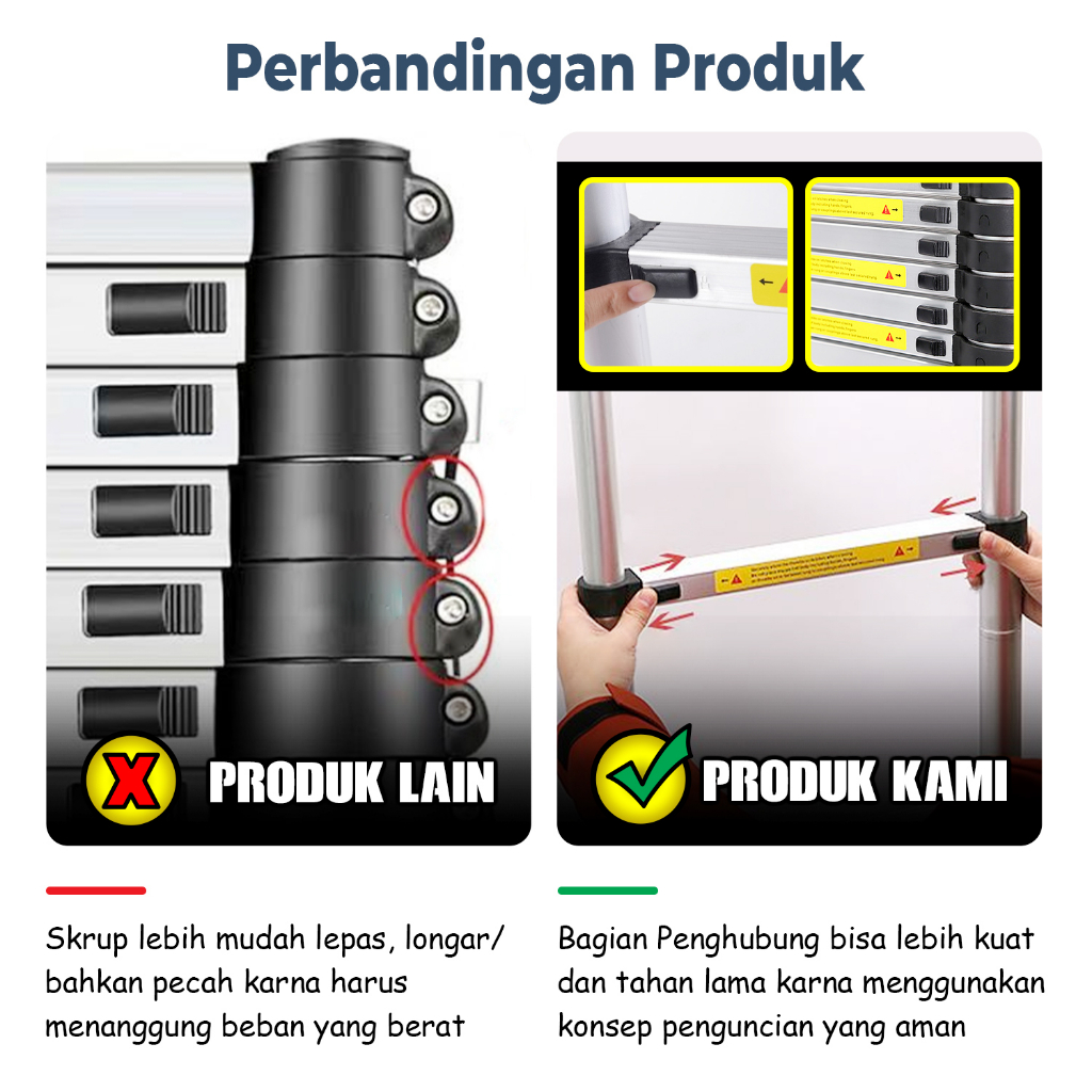Keunggulan: -Mudah di bawa kemana2 (ringan&compact) -Mudah disimpan, ukuran akan mengecil secara signifikan saat dilipat -Tidak licin, alas karet yg mengoptimalkan gesekan dengan tanah -Kunci Ergonomis, teknologi yg meningkatkan keamanan dan kemudahan -Aman dan flexibel, kunci di setiap anak tangga memberi flexibilitas pengaturan ketinggian.